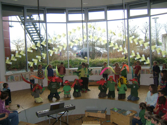 - im Schulforum mit Elementen wie: Singen, Musizieren, Feiern der Geburtstagskinder der Woche, Ehrung besonderer Leistungen (z.B. Seepferdchen, Lesekinder, Gedichtvortrag, Darbietungen der Klassen bzw. Lerngruppen, Helferkinder).