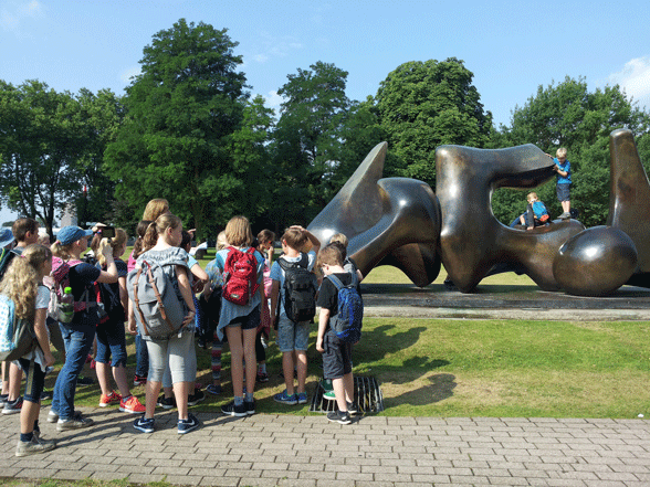 Freitag, den 07.07.2017, gingen wir auf Wanderschaft. Aber dieses Mal erwartete uns ein etwas anderer Wandertag. Seit 1977 finden alle 10 Jahre die Skulptur-Projekte in Münster statt, also auch 2017. Das brachte uns auf die Idee, dieses Jahr den alljährlichen Besuchstag im Museum mit dem Wandertag zusammen zu legen. Mit 6 Bussen uns ca. 350 Personen sind wir zu drei verschiedene Startpunkten in der Nähe des Aasees gefahren und haben uns von dort aus einige Skulpturen erwandert. Aufgrund der besonderen Umstände war es natürlich toll, dass uns einige Eltern als Unterstützung begleitet haben. Danke!