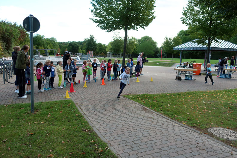 Am Freitag, den 16.09.22, fand unser Sponsoren-Lauf statt. Immer zwei Klassen liefen zusammen 30 Minuten Runde um Runde im ‚Grünen Finger‘. Jedes Kind hatte eine Laufkarte. Und für jede geschaffte Runde gab es ein Kreuzchen. Eine große Runde ist übrigens ca. 420 m lang. Kinder der Klassen 1 und 2 bekamen aber bereits immer auf der Hälfte ein Kreuzchen. Gut, dass dafür so viele ElternhelferInnen gekommen waren.