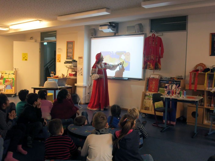 Frau Krukov und Frau Murat hatten dazu etwas Besonderes vorbereitet. Die beiden kommen aus dem mulingula-Projekt jede Woche zu uns, um mit Russich bzw. Arabisch sprechenden Kindern besondere Sprachprojekte durchzuführen.