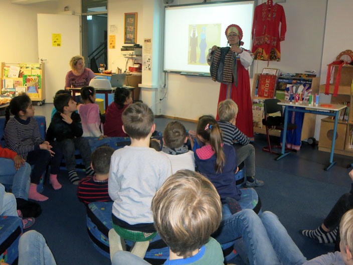 Frau Krukov und Frau Murat hatten dazu etwas Besonderes vorbereitet. Die beiden kommen aus dem mulingula-Projekt jede Woche zu uns, um mit Russich bzw. Arabisch sprechenden Kindern besondere Sprachprojekte durchzuführen.