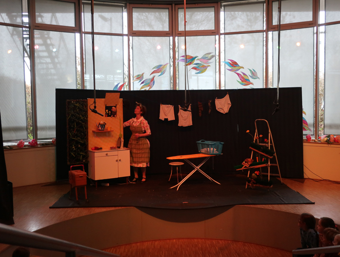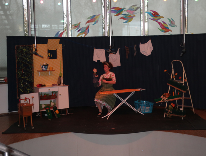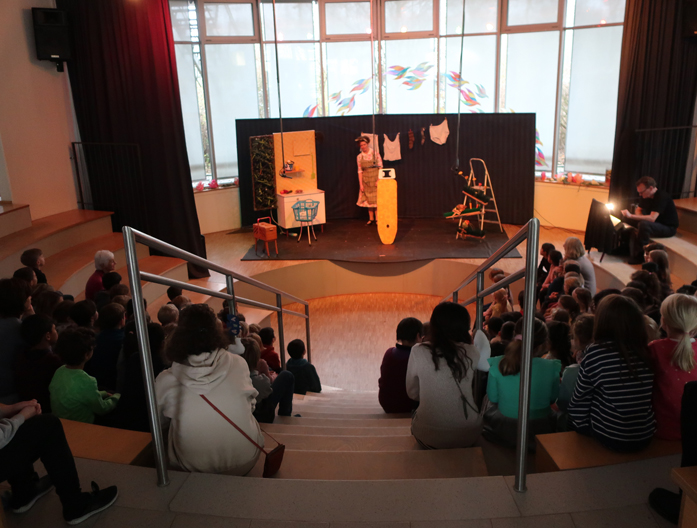 Während die ‚Großen‘ am 18.12.23 ins Stadttheater fuhren, konnten die Kinder der Klassen 1/2 ihr Theaterstück in der Schule im Forum sehen. Das Theater Tritop mit Ulrike Rehbein spielte das Solo-Stück „Frau Meier, die Amsel“.