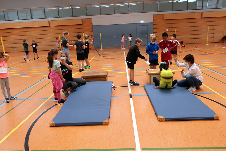 Zuerst haben die Kinder in den Klassen ihre Laufkarten gebastelt. Dann starteten die Kinder zu einer Runde um die Schule zum Aufwärmen. Mit Musik ging es dann weiter beim Dehnen auf dem Schulhof. Danach konnten die Kinder fast 30 Stationen auf dem Schulhof, in der Turnhallle und auf dem Sportgelände besuchen. Gut, dass das Wetter gehalten hat. So war das Ganze eine runde, bewegte Aktion! Und die Kinder bekamen am Schluss eine Urkunde für ihre Anstrengungen!
