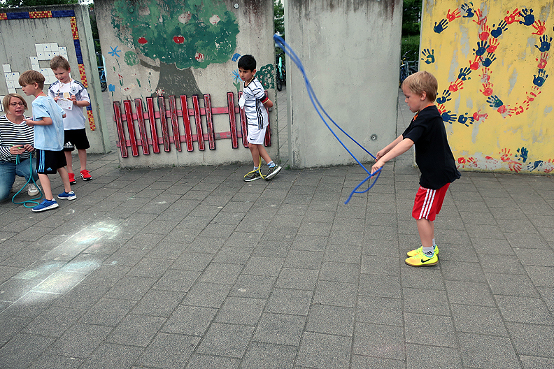 Zuerst haben die Kinder in den Klassen ihre Laufkarten gebastelt. Dann starteten die Kinder zu einer Runde um die Schule zum Aufwärmen. Mit Musik ging es dann weiter beim Dehnen auf dem Schulhof. Danach konnten die Kinder fast 30 Stationen auf dem Schulhof, in der Turnhallle und auf dem Sportgelände besuchen. Gut, dass das Wetter gehalten hat. So war das Ganze eine runde, bewegte Aktion! Und die Kinder bekamen am Schluss eine Urkunde für ihre Anstrengungen!