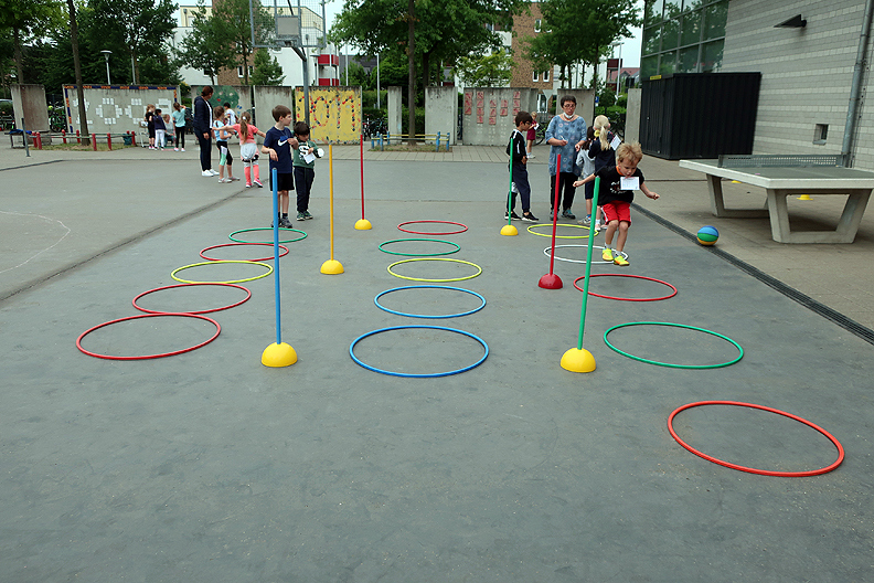 Zuerst haben die Kinder in den Klassen ihre Laufkarten gebastelt. Dann starteten die Kinder zu einer Runde um die Schule zum Aufwärmen. Mit Musik ging es dann weiter beim Dehnen auf dem Schulhof. Danach konnten die Kinder fast 30 Stationen auf dem Schulhof, in der Turnhallle und auf dem Sportgelände besuchen. Gut, dass das Wetter gehalten hat. So war das Ganze eine runde, bewegte Aktion! Und die Kinder bekamen am Schluss eine Urkunde für ihre Anstrengungen!