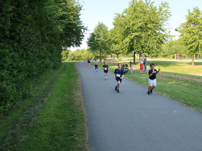 Wegen der Baustelle auf dem Schulhof fand das Trimmfest vollständig auf dem Sportgelände an der Gievenbecker Reihe (Leichtathletik-Stationen) sowie auf dem Grünen Finger‘ statt (Ausdauerlaufen und Spielstationen), in den ersten zwei Stunden für die Kinder der Klassen 1/2 und danach für die Kinder der Klassen 3/4.