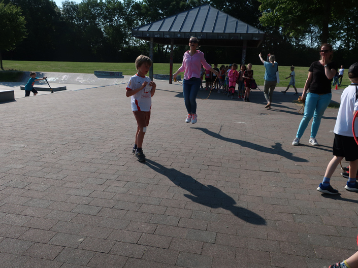 Wegen der Baustelle auf dem Schulhof fand das Trimmfest vollständig auf dem Sportgelände an der Gievenbecker Reihe (Leichtathletik-Stationen) sowie auf dem Grünen Finger‘ statt (Ausdauerlaufen und Spielstationen), in den ersten zwei Stunden für die Kinder der Klassen 1/2 und danach für die Kinder der Klassen 3/4.