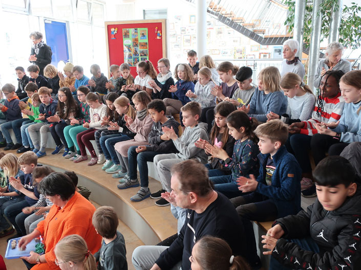 Wie vor einigen Jahren starteten wir in den Tag wieder mit einem Gottesdienst zum Thema „Bewahrung der Schöpfung“. Dabei ging es um „Die Erde in unserer Hand“. Den stimmungsvollen Gottesdienst hatten Lehrerinnen mit Mosaik-Kindern vorbereitet. DANKE!