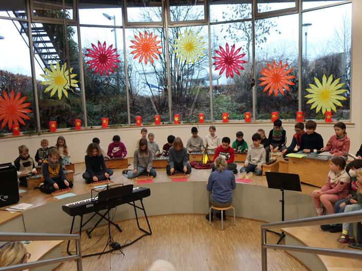 Donnerstag, der 22.12.23, war der letzte Schultag vor den Weihnachtsferien. Und endlich konnten wir nach Corona wieder ein richtiges Winterfest im Forum feiern, gleichwohl noch etwas getrennt. In der zweite Stunde starteten die Klassen 2 und 4, nach der Pause kamen dann die Klassen 1 und 3 ins Forum. Die Eltern kamen sehr zahlreich und freuten sich endlich wieder wie früher am Schulleben teilnehmen zu können. Sie sahen ein abwechslungsreiches, buntes Programm, dass die Klassen trotz der großen Krankheitswelle in den letzten Wochen auf die Beine gestellt hatten. Deutlich wurde die Botschaft: Weihnachten als Zeit des Friedens, der Eintracht, Freude, der Gemeinsamkeit. Gerade in unruhigen Zeiten wie diesen war dies eine wichtige Botschaft, die uns die Kinder geschenkt haben, was uns somit auch hoffnungsfroher in die Ferien hat starten lassen.