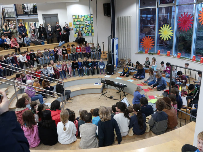 Donnerstag, der 22.12.23, war der letzte Schultag vor den Weihnachtsferien. Und endlich konnten wir nach Corona wieder ein richtiges Winterfest im Forum feiern, gleichwohl noch etwas getrennt. In der zweite Stunde starteten die Klassen 2 und 4, nach der Pause kamen dann die Klassen 1 und 3 ins Forum. Die Eltern kamen sehr zahlreich und freuten sich endlich wieder wie früher am Schulleben teilnehmen zu können. Sie sahen ein abwechslungsreiches, buntes Programm, dass die Klassen trotz der großen Krankheitswelle in den letzten Wochen auf die Beine gestellt hatten. Deutlich wurde die Botschaft: Weihnachten als Zeit des Friedens, der Eintracht, Freude, der Gemeinsamkeit. Gerade in unruhigen Zeiten wie diesen war dies eine wichtige Botschaft, die uns die Kinder geschenkt haben, was uns somit auch hoffnungsfroher in die Ferien hat starten lassen.