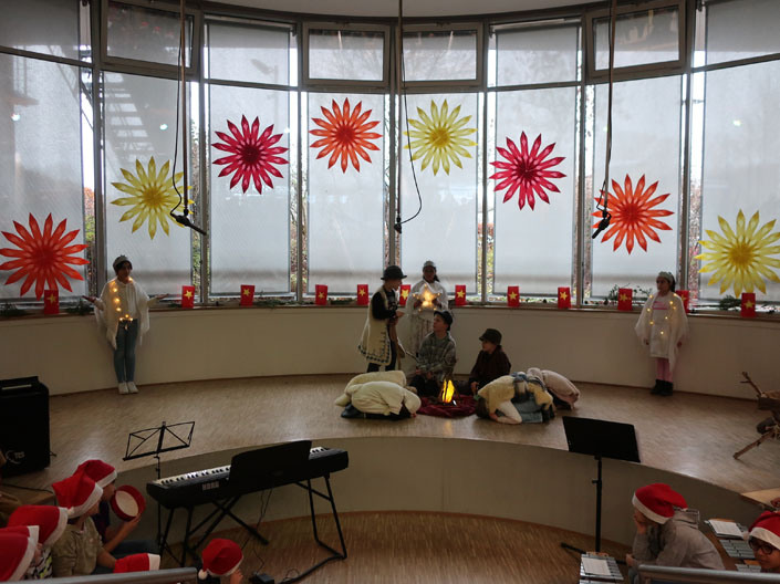 Donnerstag, der 22.12.23, war der letzte Schultag vor den Weihnachtsferien. Und endlich konnten wir nach Corona wieder ein richtiges Winterfest im Forum feiern, gleichwohl noch etwas getrennt. In der zweite Stunde starteten die Klassen 2 und 4, nach der Pause kamen dann die Klassen 1 und 3 ins Forum. Die Eltern kamen sehr zahlreich und freuten sich endlich wieder wie früher am Schulleben teilnehmen zu können. Sie sahen ein abwechslungsreiches, buntes Programm, dass die Klassen trotz der großen Krankheitswelle in den letzten Wochen auf die Beine gestellt hatten. Deutlich wurde die Botschaft: Weihnachten als Zeit des Friedens, der Eintracht, Freude, der Gemeinsamkeit. Gerade in unruhigen Zeiten wie diesen war dies eine wichtige Botschaft, die uns die Kinder geschenkt haben, was uns somit auch hoffnungsfroher in die Ferien hat starten lassen.