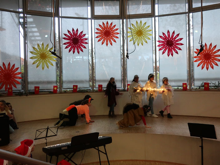 Donnerstag, der 22.12.23, war der letzte Schultag vor den Weihnachtsferien. Und endlich konnten wir nach Corona wieder ein richtiges Winterfest im Forum feiern, gleichwohl noch etwas getrennt. In der zweite Stunde starteten die Klassen 2 und 4, nach der Pause kamen dann die Klassen 1 und 3 ins Forum. Die Eltern kamen sehr zahlreich und freuten sich endlich wieder wie früher am Schulleben teilnehmen zu können. Sie sahen ein abwechslungsreiches, buntes Programm, dass die Klassen trotz der großen Krankheitswelle in den letzten Wochen auf die Beine gestellt hatten. Deutlich wurde die Botschaft: Weihnachten als Zeit des Friedens, der Eintracht, Freude, der Gemeinsamkeit. Gerade in unruhigen Zeiten wie diesen war dies eine wichtige Botschaft, die uns die Kinder geschenkt haben, was uns somit auch hoffnungsfroher in die Ferien hat starten lassen.