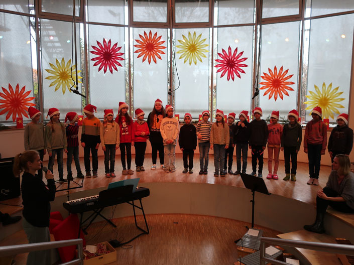 Donnerstag, der 22.12.23, war der letzte Schultag vor den Weihnachtsferien. Und endlich konnten wir nach Corona wieder ein richtiges Winterfest im Forum feiern, gleichwohl noch etwas getrennt. In der zweite Stunde starteten die Klassen 2 und 4, nach der Pause kamen dann die Klassen 1 und 3 ins Forum. Die Eltern kamen sehr zahlreich und freuten sich endlich wieder wie früher am Schulleben teilnehmen zu können. Sie sahen ein abwechslungsreiches, buntes Programm, dass die Klassen trotz der großen Krankheitswelle in den letzten Wochen auf die Beine gestellt hatten. Deutlich wurde die Botschaft: Weihnachten als Zeit des Friedens, der Eintracht, Freude, der Gemeinsamkeit. Gerade in unruhigen Zeiten wie diesen war dies eine wichtige Botschaft, die uns die Kinder geschenkt haben, was uns somit auch hoffnungsfroher in die Ferien hat starten lassen.