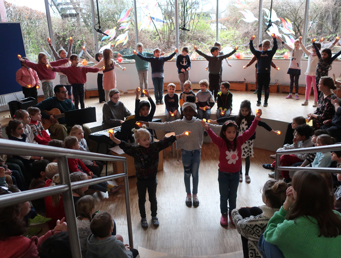 Freitag, der 20.12.23, der letzte Schultag im Jahr ist der Tag des Winterfestes – dieses Jahr zu unserem Adventsthema „Frieden“ gestaltet von den Klassen 2 und 3. Und das haben die Kinder sehr stimmungsvoll gemacht. Die vielen Gäste waren alle sehr gerührt und angetan. Zwischen den Beiträgen der Klassen haben wir immer gemeinsam Lieder gesungen. Ein toller, aber auch ein nachdenklich stimmender Abschluss des Jahres! Danke dafür!
