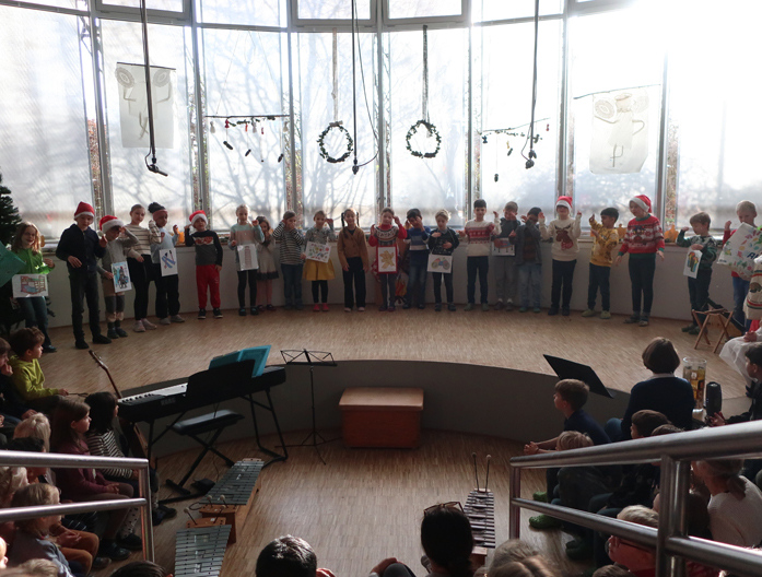 Das Forum war wegen der vielen zusätzlichen Besucher besonders voll. Eltern, Großeltern, …. , die gesamte Mosaik-Gemeinschaft konnte sich prima auf Weihnachten einstimmen, denn ab 10:45 Uhr hatten die Klassen 2 und 3 ein tolles winterlich-adventliches Programm zusammengestellt mit Liedern, Instrumenten, Raps, Tänzen, Theaterstücken, teilweise auch auf Englisch.